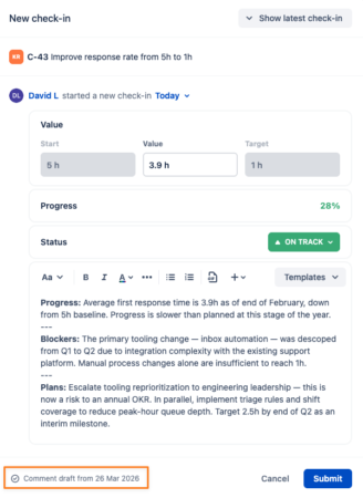 When you open a check-in and start filling it in, Oboard now saves your work automatically as a draft. Close the window, navigate away, come back later: everything you entered will still be there when you reopen the check-in.