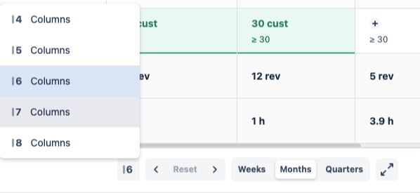 At the bottom of the table, switch between Weeks, Months, and Quarters to change the time granularity, and choose how many columns to display — from 4 to 8. There’s also a full-screen button to expand the view when you need more space.